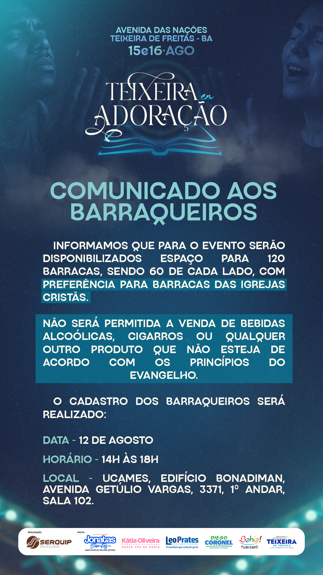 A organização do evento religioso “Teixeira em Adoração”, que acontecerá nos dias 15 e 16 de agosto na Avenida das Nações, em Teixeira de Freitas – BA, divulgou um comunicado importante para os barraqueiros interessados em participar da feira de vendas durante o evento.