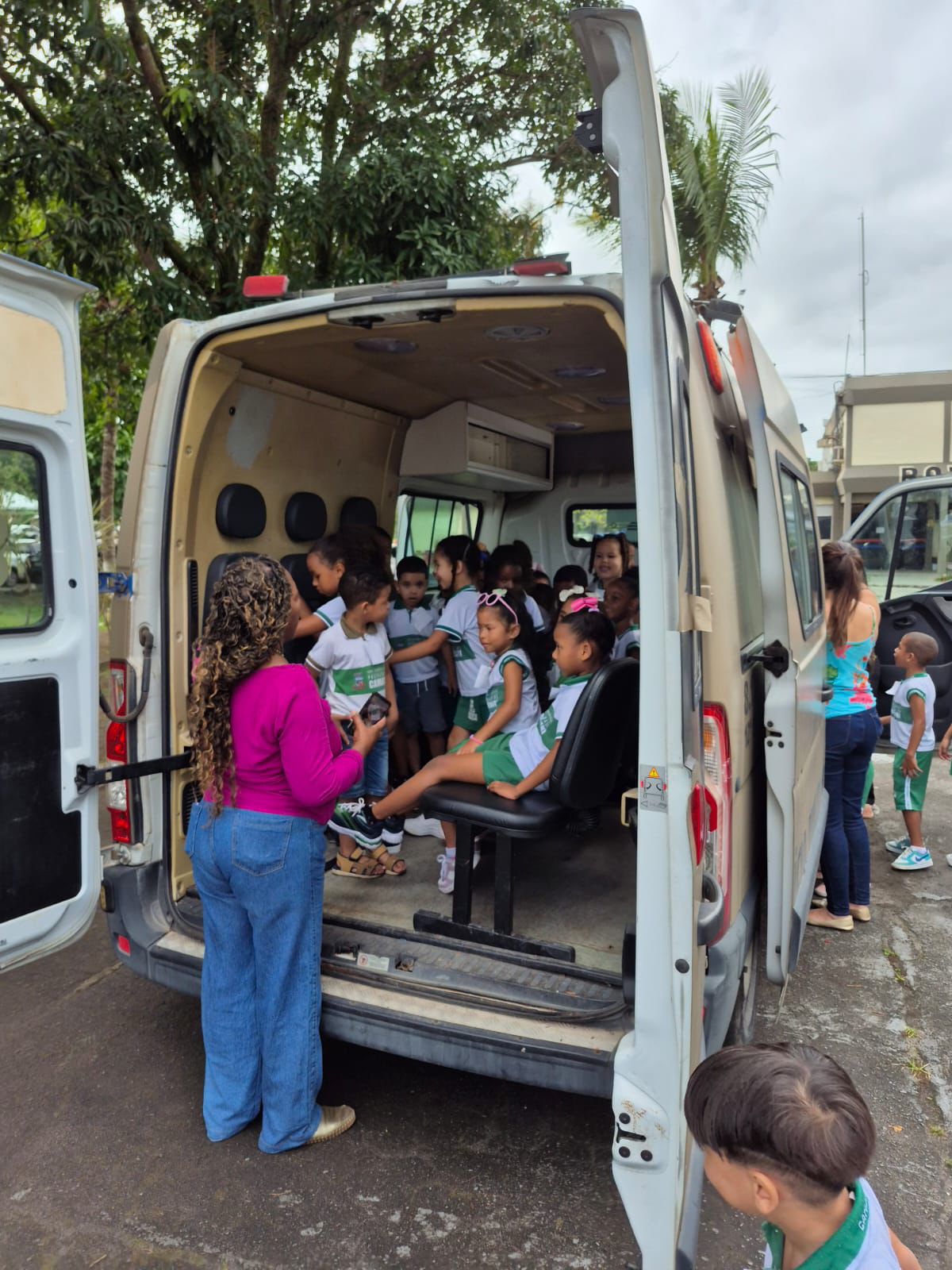 As crianças interagiram com o efetivo da unidade, conhecendo um pouco mais da rotina policial. Em seguida, puderam explorar os materiais e equipamentos de trabalho e conheceram de perto as viaturas utilizadas nas ações de patrulhamento diário.