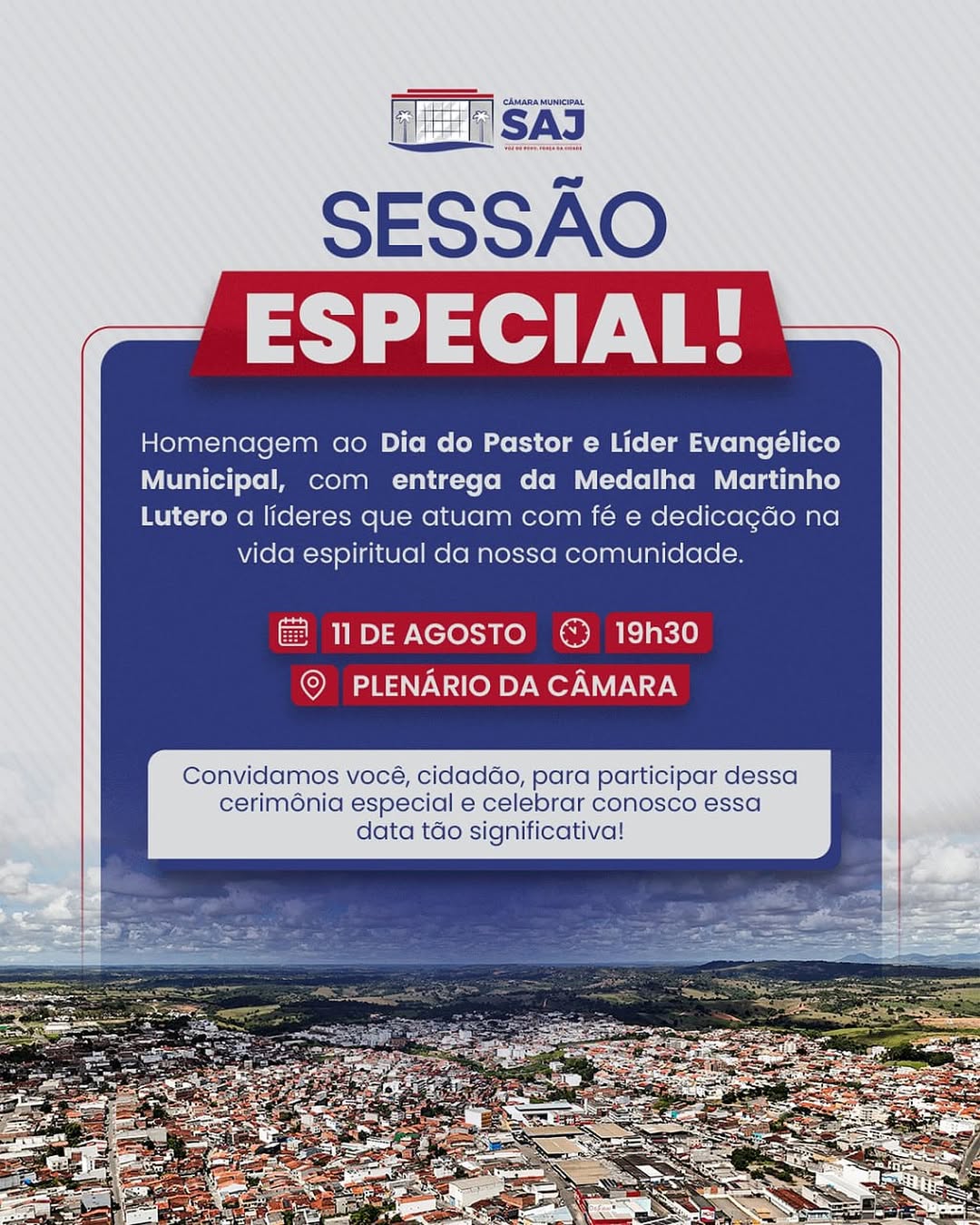 A Câmara Municipal de Santo Antônio de Jesus promove, nesta segunda-feira (11), uma Sessão Especial em homenagem ao Dia do Pastor e Líder Evangélico Municipal. A cerimônia terá como destaque a entrega da Medalha Martinho Lutero a líderes religiosos que se destacam por seu trabalho de fé, dedicação e contribuição para a vida espiritual da comunidade.