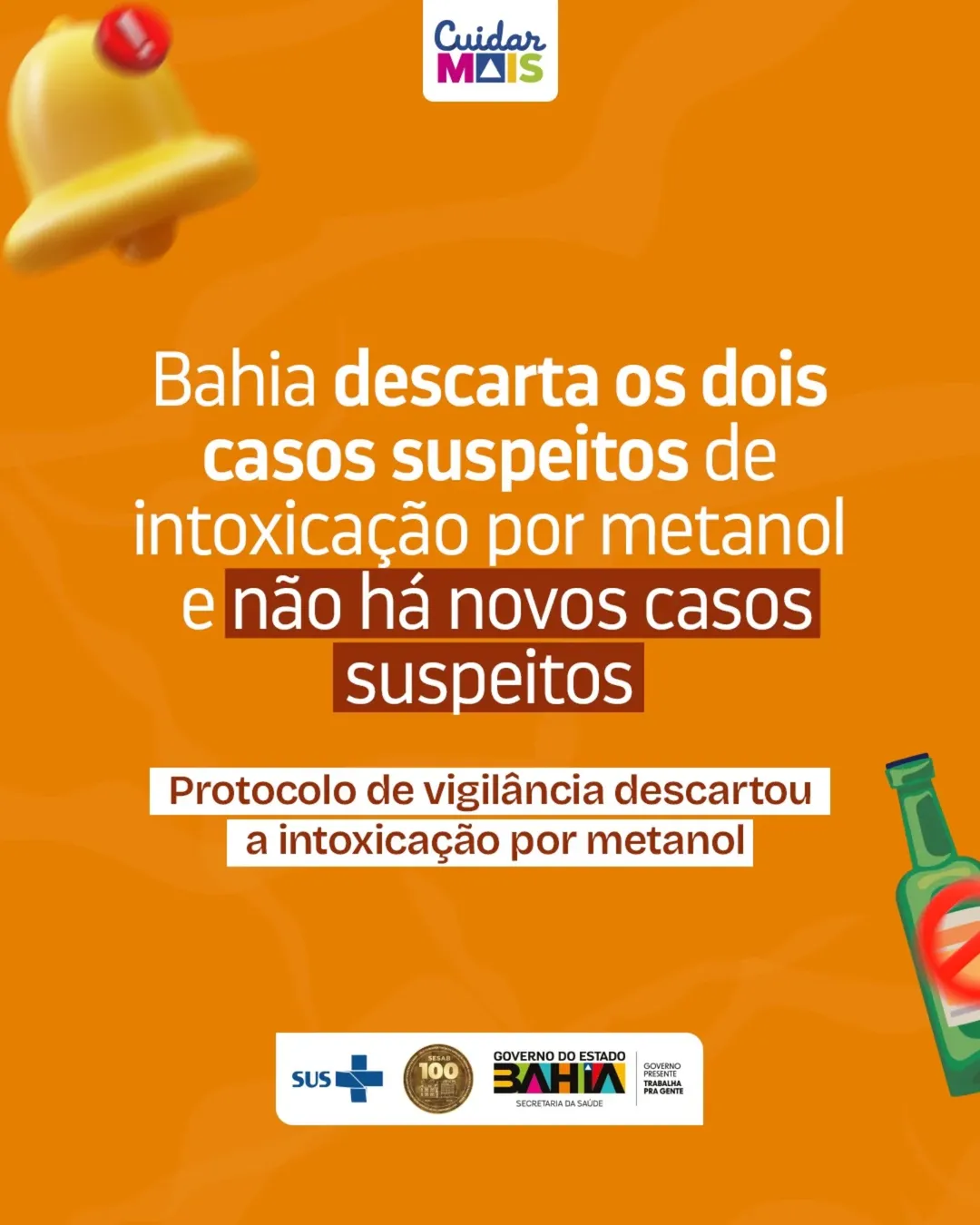 A Secretaria da Saúde do Estado da Bahia (Sesab) descartou, neste domingo (5), os dois casos suspeitos de intoxicação por metanol que estavam sob investigação no estado. As ocorrências haviam sido registradas nos municípios de Feira de Santana e Salvador.