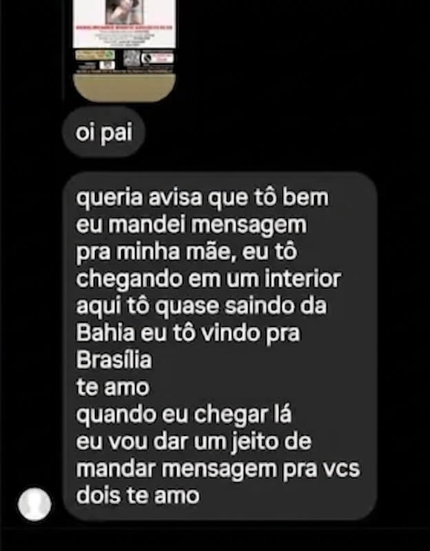 Em uma mensagem enviada posteriormente pelas redes sociais, a jovem entrou em contato com o pai, afirmando que estava bem e que havia chegado a uma cidade do interior próxima a Brasília.